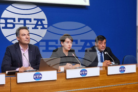 София (13 септември 2024) В Националния пресклуб на БТА се провежда пресконференция на Инициатива „Правосъдие за всеки“, на тема „Спиране на процедурата по избор на главен прокурор - правни възможности и политическа воля". Участват (от ляво надясно): Емил Георгиев, София Грънчарова и Велислав Величков.