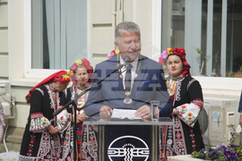 Ямбол (21 април 2022) Кулминацията на празника по случай 35 годишнина на Община Тунджа завърши с тържествена сесия, на която бяха връчени награди на заслужили дейци допринесли за развитието на общината. На празника присъства зам.-председателят на НС Кристиан Вигенин (3 дясно), Георги Георгиев (3 ляво), кмет на Община Тундж и др.