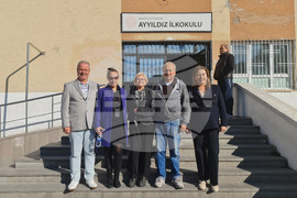 В секцията, намираща се в начално училище „Аййълдъз“, избирателите могат да гласуват машинно, както и с хартиени бюлетини. На снимката (от ляво надясно): Юксел Йозкале, председател на БИСАВ, кореспондентът на БТА в Анкара Нора Чолакова, Хатидже Аглач, преподавателка по български език и член на БИСАВ.