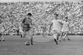 София (27 юли 1970) Тържествено закриване на футболното първенство 1969-70 г. На снимката: Капитанът на "Левски Спартак" Георги Аспарухов получава купата и знамето на своя отбор-шампион за 1969-70 година. Пресфото-БТА снимка: Божидар Тодоров/архив
