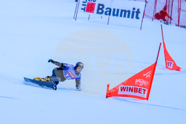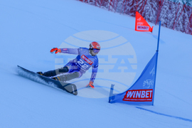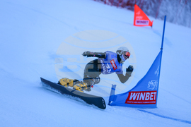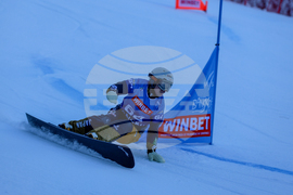 Банско (18 януари 2025) На писта „Алберто Томба“ в Банско се провеждат квалификации за Световната купа по алпийски сноуборд за мъже и жени. На снимката: Тервел Замфиров записа седми резултат в квалификацията на паралелния гигантски слалом от Световната купа по алпийски сноуборд в Банско.
