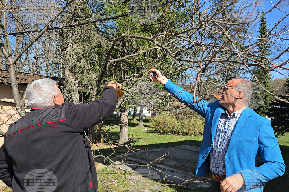Априлци (22 март 2025) С ритуално зарязване на овощно дърво в квартал Острец в Априлци посрещат пролетта. Двадесет и втори март е празник на Острец и се чества като Ден на овощаря и Първи ден на пролетта. След приветствието на кмета на общината Тихомир Кукенски (вдясно) се провежда празнична програма, в която освен местни самодейци, деца и ученици, се включват гайдарски и кукерски състав при Народно читалище „Христо Ботев - 1869” в Калофер.