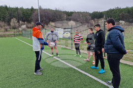 Перник (1 април 2025) В Перник се провежда първа тренировка за юноши по ръгби след повече от десетгодишна пауза. Треньорът Венцислав Михов (вляво) събра бъдещите състезатели на игрището с изкуствена настилка до стадион „Металург”, в пернишкия квартал „Изток”.