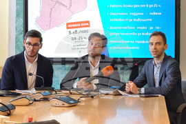 София (3 юни 2025) Пресконференция на политическата група на „Спаси София” относно реформа в паркирането в София. На снимката (от ляво надясно): Стефан Спасов, Борис Бонев и Андрей Зографски от групата на „Спаси София”.