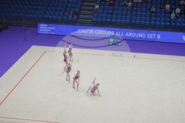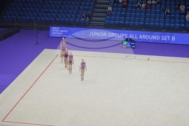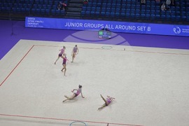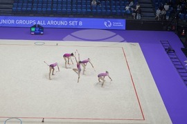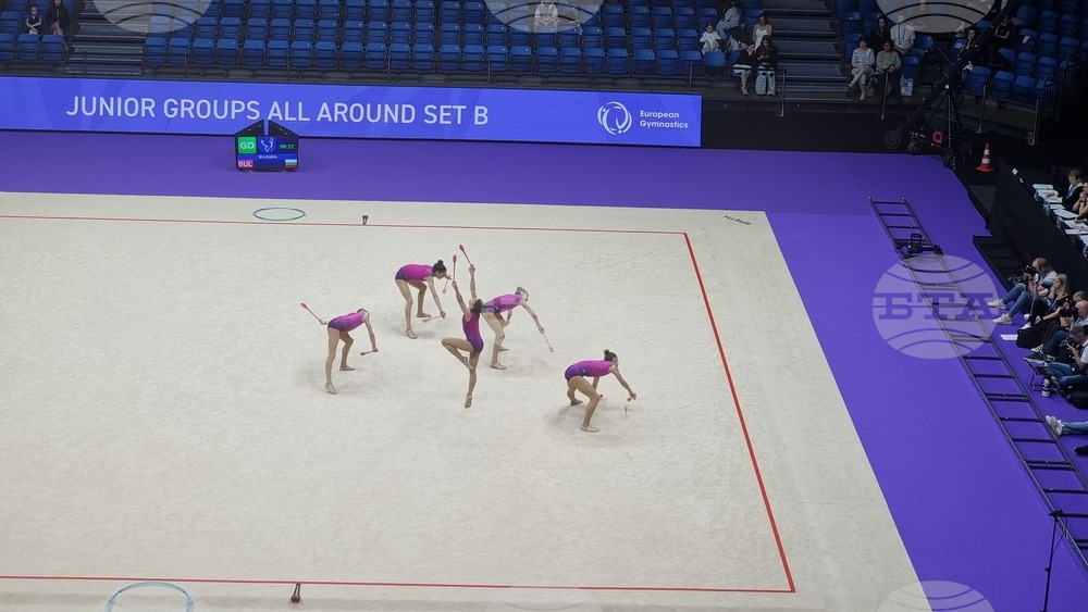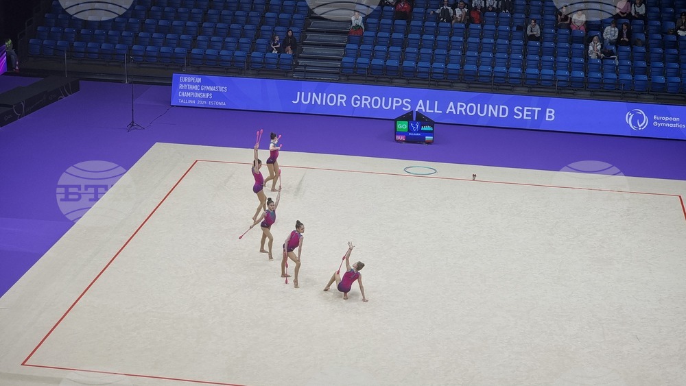 Талин (4 юни 2025) В Талин се провежда 41-ото Европейско първенство по художествена гимнастика. Ансамбълът на България за девойки играе съчетание с 5 чифта бухалки.