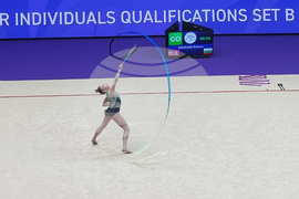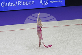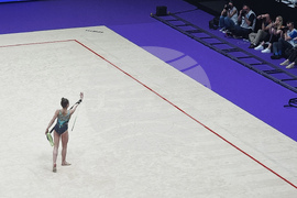 Талин (6 юни 2025) Европейско първенство по художествена гимнастика се провежда в Талин. На снимката: Дара Стоянова играе съчетание с лента.