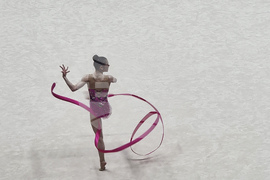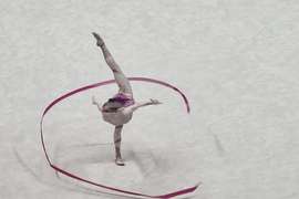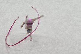 Талин (6 юни 2025) Европейско първенство по художествена гимнастика се провежда в Талин. На снимката: Стилияна Николова играе съчетание с лента.