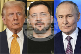 FILE - In this combination of file photos, President Donald Trump, left, and Ukraine's President Volodymyr Zelenskyy, center, are seen at the Elysee Palace, Dec. 7, 2024 in Paris, and President Vladimir Putin, right, addresses a Technology Forum in Moscow on Feb. 21, 2025. (AP Photo/Aurelien Morissard, left and center, Pavel Bednyakov, right, File)