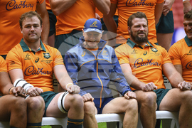Australian rugby union players Harry Wilson, left, James Slipper, right, and coach Joe Schmidt pose for a photo during the captain's run in Brisbane, Friday, July 18, 2025, ahead of the first match of a 3-test series agains the British & Irish Lions. (Jono Searle/AAP Image via AP)