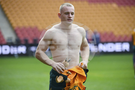 Australian rugby union player Max Jorgensen removes his shirt during the captain's run in Brisbane, Friday, July 18, 2025, ahead of the first match of a 3-test series agains the British & Irish Lions. (Jono Searle/AAP Image via AP)