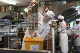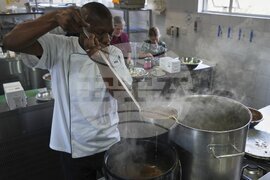 A culinary student pours a cooked soup into a container, as chefs, community cooks, caterers, and culinary students joined forces to whip together 67,000 litres of soup in celebration of Nelson Mandela Day in Johannesburg, South Africa, Friday, July 18, 2025. (AP Photo/Alfonso Nqunjana)