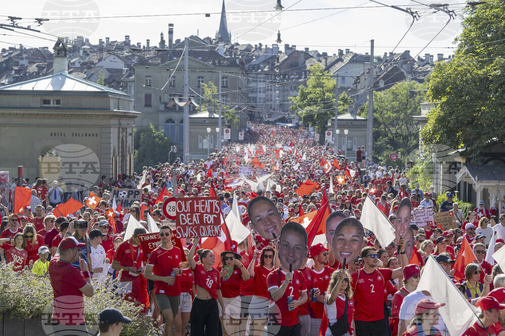 Switzerland fans ahead of the Women's Euro 2025 quarterfinal soccer match between Switzerland and Spain in Bern, Switzerland, Friday July 18, 2025. (Urs Flueeler/Keystone via AP)