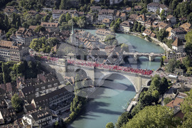 In this aerial image, Switzerland fans cross the Nydeggbrücke bridge as they march to the stadium ahead of the Women's Euro 2025 quarterfinal soccer match between Switzerland and Spain in Bern, Switzerland, Friday July 18, 2025. (Thomas Hodel/Keystone via AP)