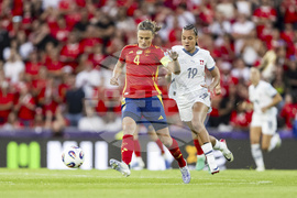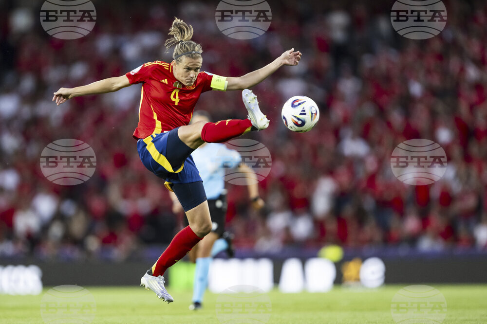Spain's Irene Paredes in action during the Women's Euro 2025 quarterfinal soccer match between Switzerland and Spain at Wankdorf stadium in Bern, Switzerland, Friday July 18, 2025. (Anthony Anex/Keystone via AP)