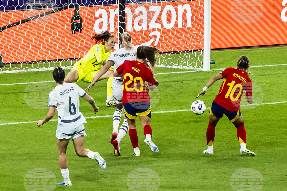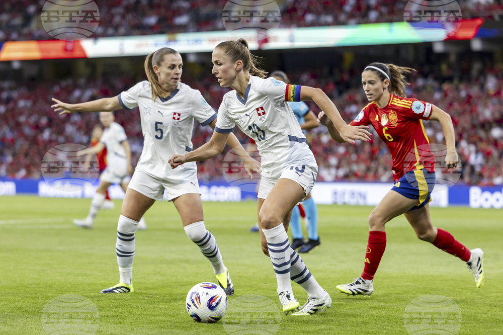 Spain's Ona Batlle, center left, and Switzerland's Smilla Vallotto in action during the Women's Euro 2025 quarterfinal soccer match between Switzerland and Spain at Wankdorf stadium in Bern, Switzerland, Friday July 18, 2025. (Anthony Anex/Keystone via AP)
