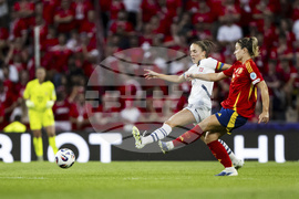 Switzerland's Iman Beney, left, and Spain's Laia Aleixandri in action during the Women's Euro 2025 quarterfinal soccer match between Switzerland and Spain at Wankdorf stadium in Bern, Switzerland, Friday July 18, 2025. (Anthony Anex/Keystone via AP)