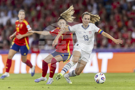 Switzerland's Viola Calligaris, left, and Spain's Aitana Bonmati in action during the Women's Euro 2025 quarterfinal soccer match between Switzerland and Spain at Wankdorf stadium in Bern, Switzerland, Friday July 18, 2025. (Anthony Anex/Keystone via AP)