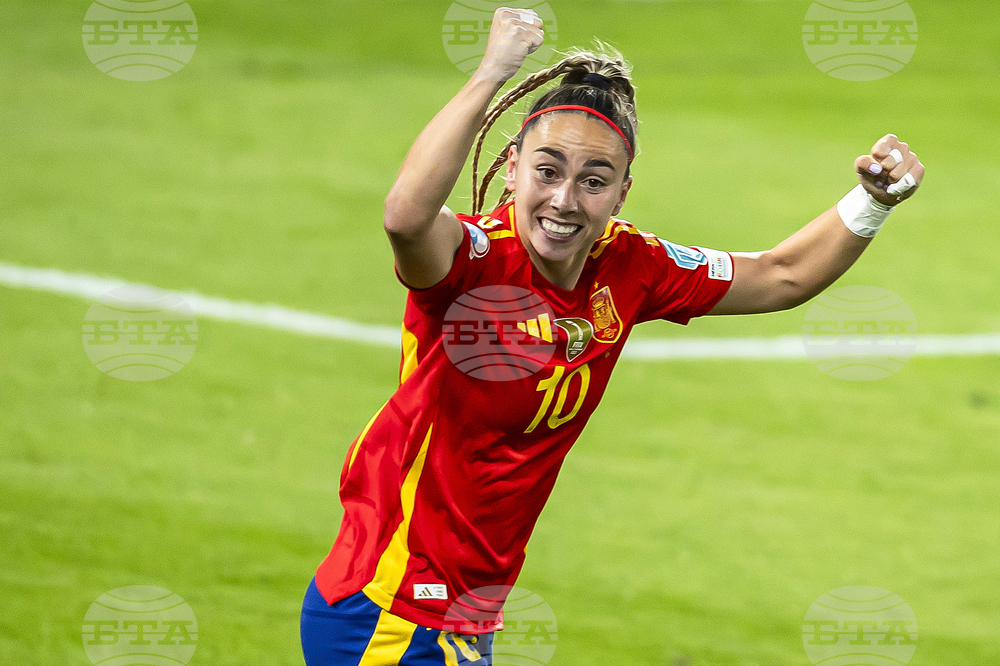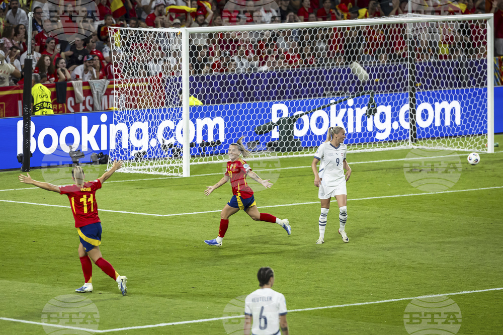 Spain's Athenea Del Castillo, 2nd left, celebrates scoring with teammates during the Women's Euro 2025 quarterfinal soccer match between Switzerland and Spain at Wankdorf stadium in Bern, Switzerland, Friday July 18, 2025. (Michael Buholzer/Keystone via AP)