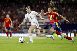 Spain's Olga Carmona, left, and Switzerland's Lia Waelti in action during the Women's Euro 2025 quarterfinal soccer match between Switzerland and Spain at Wankdorf stadium in Bern, Switzerland, Friday July 18, 2025. (Peter Klaunzer/Keystone via AP)