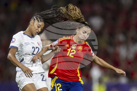Spain's Irene Paredes, left, and Switzerland's Iman Beney in action during the Women's Euro 2025 quarterfinal soccer match between Switzerland and Spain at Wankdorf stadium in Bern, Switzerland, Friday July 18, 2025. (Anthony Anex/Keystone via AP)