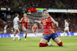 Spain's Athenea Del Castillo celebrates scoring during the Women's Euro 2025 quarterfinal soccer match between Switzerland and Spain at Wankdorf stadium in Bern, Switzerland, Friday July 18, 2025. (Anthony Anex/Keystone via AP)