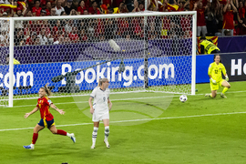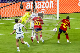 Spain's Claudia Pina, no. 20, scores during the Women's Euro 2025 quarterfinal soccer match between Switzerland and Spain at Wankdorf stadium in Bern, Switzerland, Friday July 18, 2025. (Michael Buholzer/Keystone via AP)