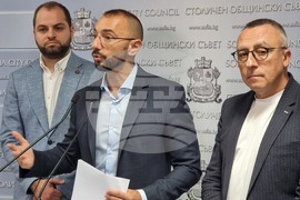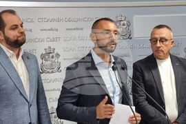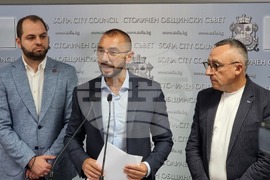София (21 юли 2025) Общинските съветници Антон Хекимян, Диян Стаматов и Драгомир Младенов от групата на ГЕРБ в Столичния общински съвет дават брифинг в Столичната община за Мемориала на Първи и Шести пехотен полк. На снимката (от ляво надясно): общинските съветници от групата на ГЕРБ Драгомир Младенов, Антон Хекимян и Диян Стаматов.