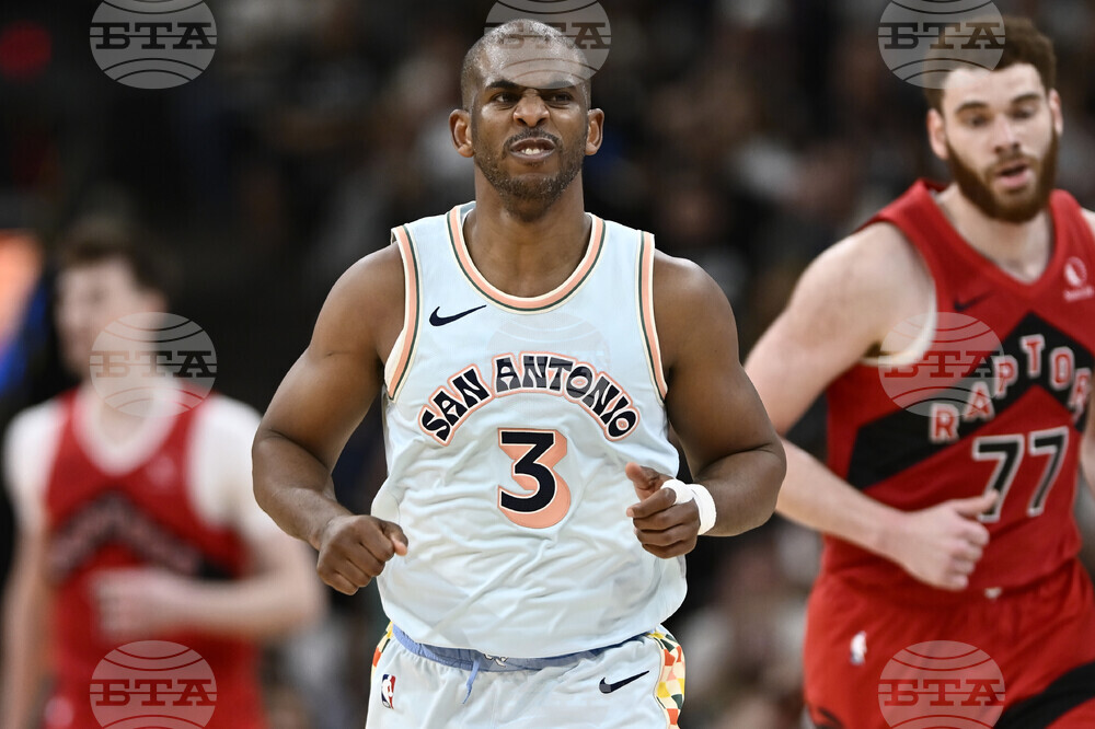 FILE - San Antonio Spurs guard Chris Paul (3) celebrates a basket during the second half of an NBA basketball game against the Toronto Raptors, April 13, 2025, in San Antonio. (AP Photo/Darren Abate, File)