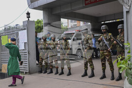 Law enforcement officers stand guard at the entrance of the National Institute of Burn and Plastic Surgery as survivors are treated inside after a Bangladesh air force training aircraft crashed into a school in the nation's capital Monday afternoon in Dhaka, Bangladesh, Tuesday, July 22, 2025.( AP Photo/ Mahmud Hossain Opu)