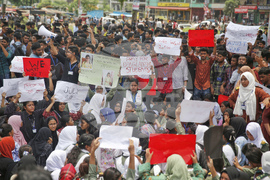 Students shout slogans during a protest near secretariat against the crash of a Bangladesh air force training jet into a school, demanding accountability, compensation for victims' families and the halt of training flights, in Dhaka, Bangladesh, Tuesday, July 22, 2025. (AP Photo/Mahmud Hossain Opu)