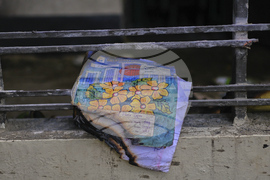 A burnt book of a student is seen at the window of a school after a Bangladesh air force training jet crashed into it Monday in Dhaka, Bangladesh, Tuesday, July 22, 2025. (AP Photo/Mahmud Hossain Opu)