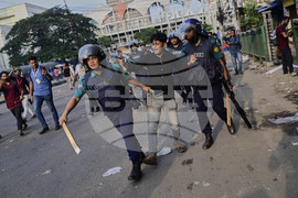 Police officers stand guard as students shout slogans during a protest near the site of the crash of a Bangladesh air force training jet into a school, demanding accountability, compensation for victims' families and the halt of training flights, in Dhaka, Bangladesh, Tuesday, July 22, 2025. (AP Photo/Mahmud Hossain Opu)