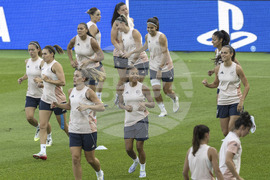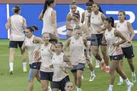 Spain's players attend a training session ahead of their Women's Euro 2025 semifinal soccer match against Germany at Letzigund Stadium in Zurich, Switzerland, Tuesday, 22. July 2025. (Urs Flueeler/Keystone via AP)