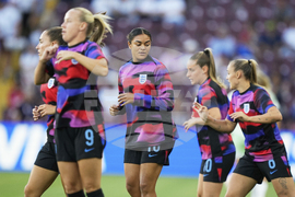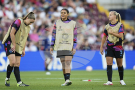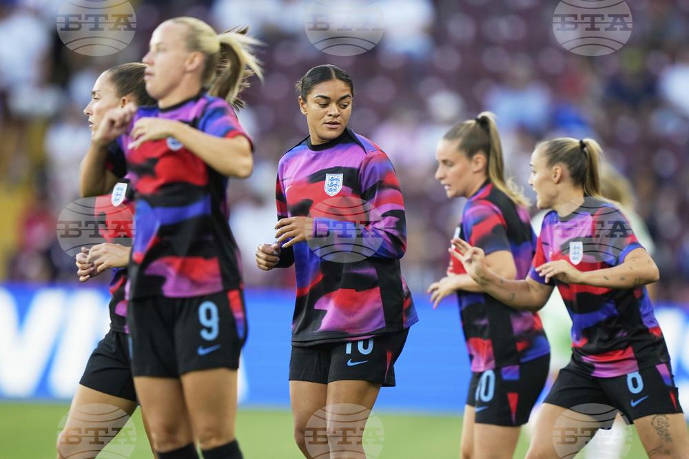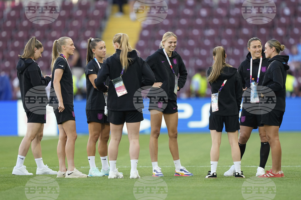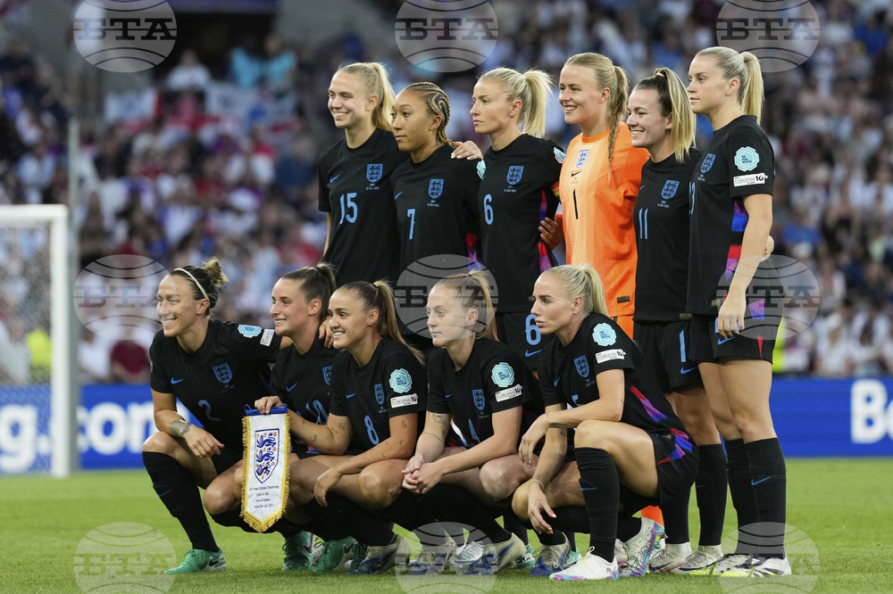 England players pose before the Women's Euro 2025 semifinals soccer match between England and Italy at Stade de Geneve in Geneva, Switzerland, Tuesday, July 22, 2025. (AP Photo/Alessandra Tarantino)