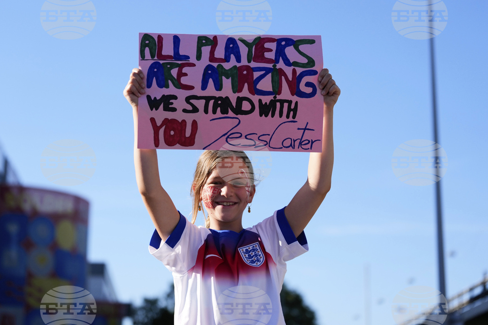 England fans hold a poster in solidarity with England's Jess Carter ahead of the Women's Euro 2025 semifinals soccer match between England and Italy at Stade de Geneve in Geneva, Switzerland, Tuesday, July 22, 2025. (AP Photo/Martin Meissner)