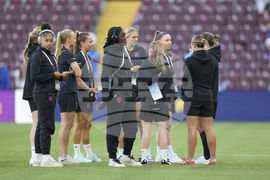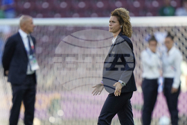 England head coach Sarina Wiegman, centre, walks on the pitch ahead of the Women's Euro 2025 semifinals soccer match between England and Italy at Stade de Geneve in Geneva, Switzerland, Tuesday, July 22, 2025. (AP Photo/Martin Meissner)