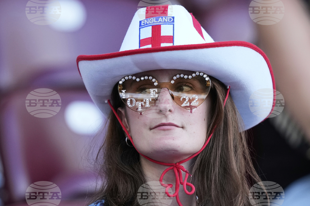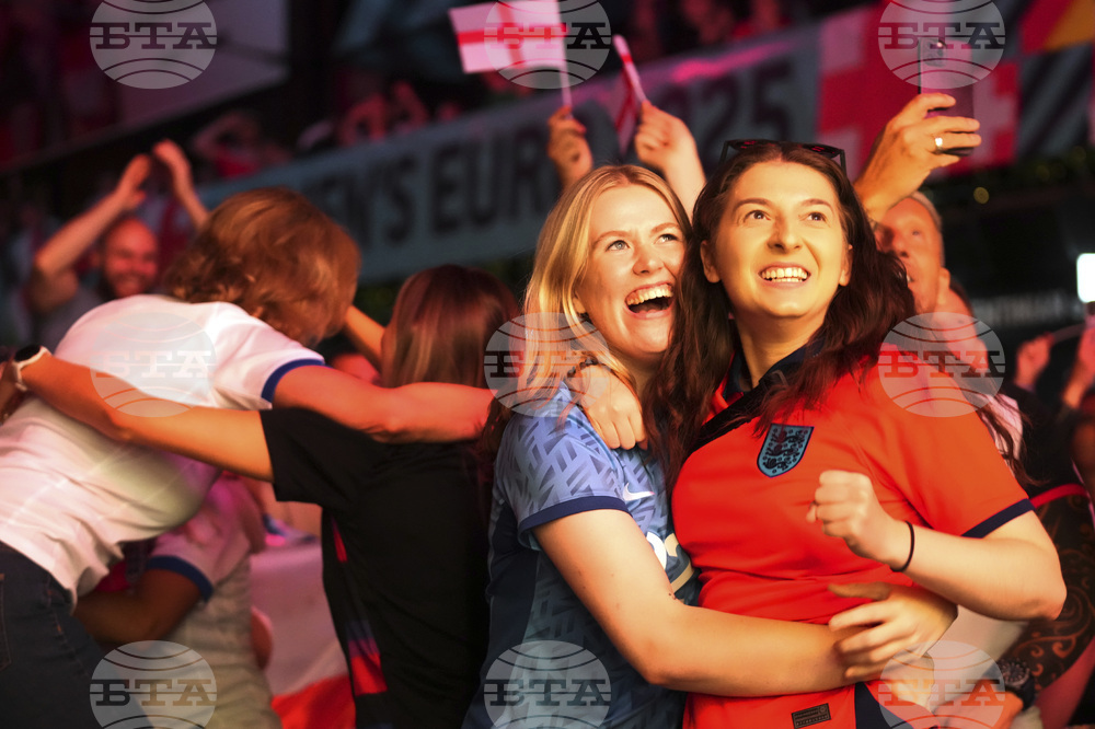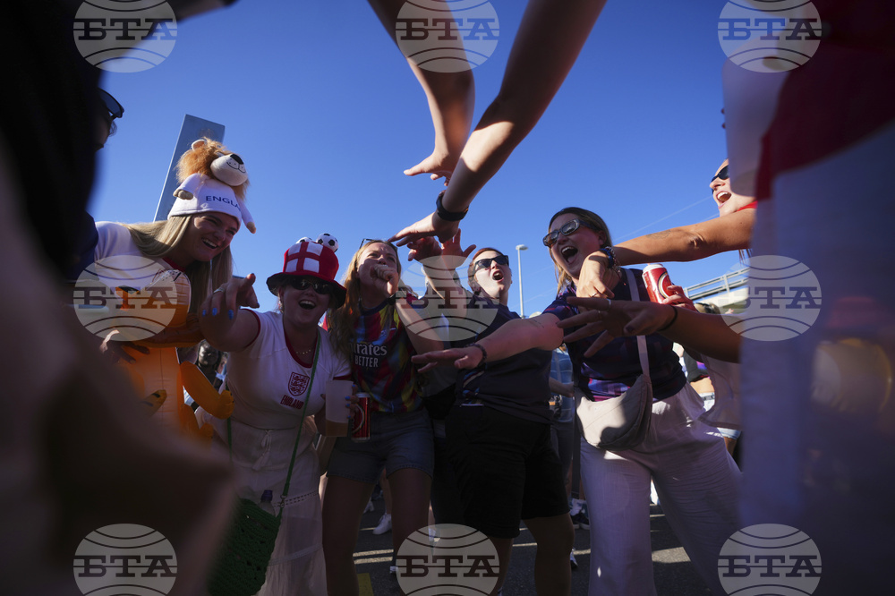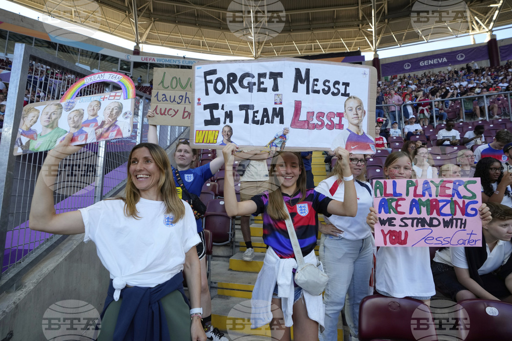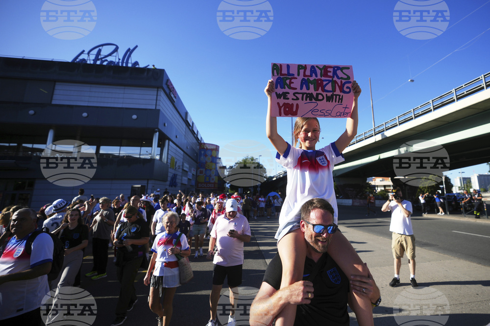 England fans cheer outside the stadium before the Women's Euro 2025 semifinals soccer match between England and Italy at Stade de Geneve in Geneva, Switzerland, Tuesday, July 22, 2025. (AP Photo/Alessandra Tarantino)