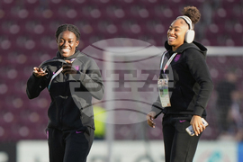England's Michelle Agyemang, left, and England goalkeeper Khiara Keating stand on the pitch ahead of the Women's Euro 2025 semifinals soccer match between England and Italy at Stade de Geneve in Geneva, Switzerland, Tuesday, July 22, 2025. (AP Photo/Martin Meissner)