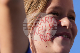 A young England fan wears the names of England players Jess Carter, Chloe Kelly and Alessia Russo on her face while walking to the stadium for the Women's Euro 2025 semifinals soccer match between England and Italy at Stade de Geneve in Geneva, Switzerland, Tuesday, July 22, 2025. (AP Photo/Alessandra Tarantino)