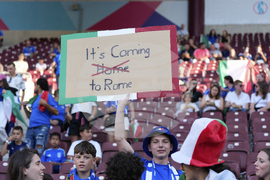 An Italy fan hold up a sign on the stands before the Women's Euro 2025 semifinals soccer match between England and Italy at Stade de Geneve in Geneva, Switzerland, Tuesday, July 22, 2025. (AP Photo/Alessandra Tarantino)