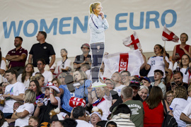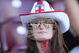England fans on the stands wait for the start of the Women's Euro 2025 semifinals soccer match between England and Italy at Stade de Geneve in Geneva, Switzerland, Tuesday, July 22, 2025. (AP Photo/Martin Meissner)