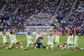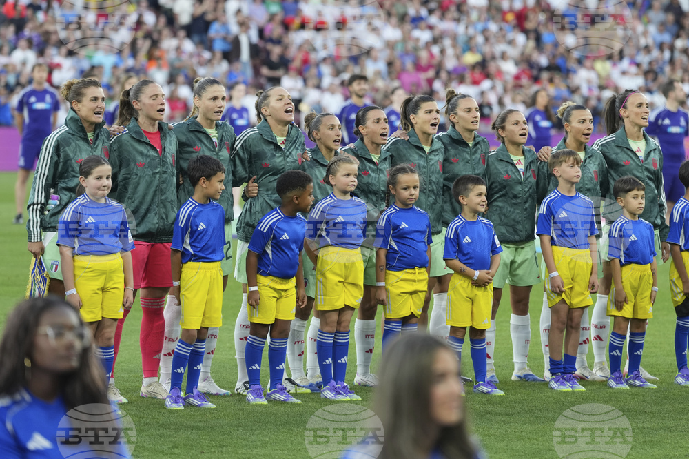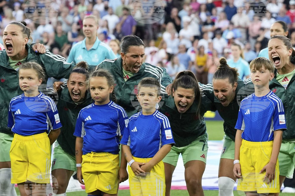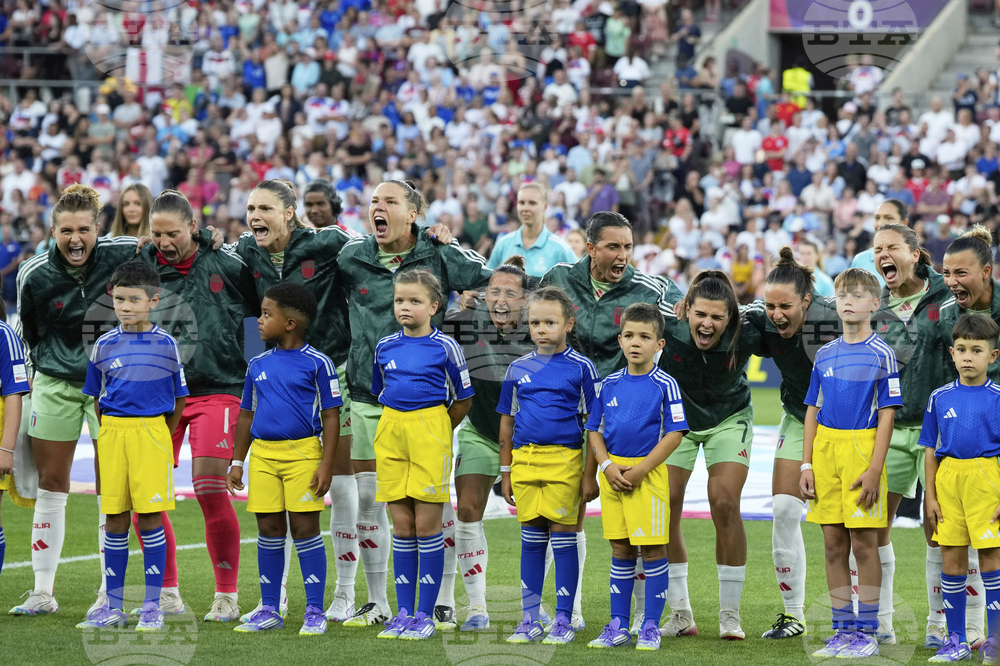 Italy players stand during the national anthem before the Women's Euro 2025 semifinals soccer match between England and Italy at Stade de Geneve in Geneva, Switzerland, Tuesday, July 22, 2025. (AP Photo/Martin Meissner)