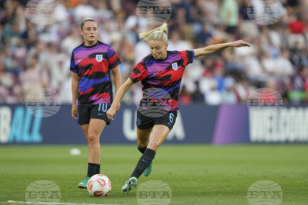 England's Leah Williamson warms up prior to the Women's Euro 2025 semifinals soccer match between England and Italy at Stade de Geneve in Geneva, Switzerland, Tuesday, July 22, 2025. (AP Photo/Martin Meissner)