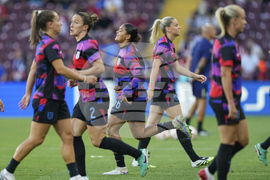 England team walk on the pitch ahead of the Women's Euro 2025 semifinals soccer match between England and Italy at Stade de Geneve in Geneva, Switzerland, Tuesday, July 22, 2025. (AP Photo/Martin Meissner)