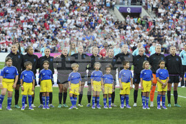 England, left, and Italy players line up before the Women's Euro 2025 semifinals soccer match between England and Italy at Stade de Geneve in Geneva, Switzerland, Tuesday, July 22, 2025. (Salvatore Di Nolfi/Keystone via AP)