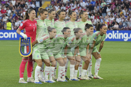 Italy starting players pose for a team photo at the beginning of the Women's Euro 2025 semifinals soccer match between England and Italy at Stade de Geneve in Geneva, Switzerland, Tuesday, July 22, 2025. (AP Photo/Martin Meissner)