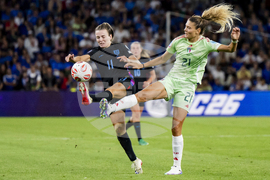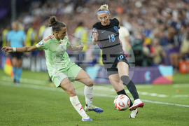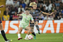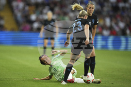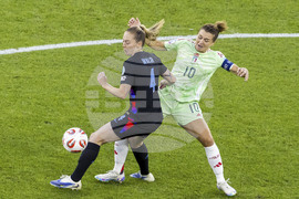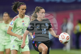 England's Lauren James vies for the ball with Italy's Cristiana Girelli, left, during the Women's Euro 2025 semifinals soccer match between England and Italy at Stade de Geneve in Geneva, Switzerland, Tuesday, July 22, 2025. (AP Photo/Alessandra Tarantino)