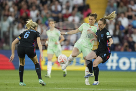 Italy's Cristiana Girelli reaches for the ball next to England's Lauren James, right, during the Women's Euro 2025 semifinals soccer match between England and Italy at Stade de Geneve in Geneva, Switzerland, Tuesday, July 22, 2025. (AP Photo/Alessandra Tarantino)