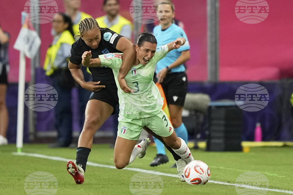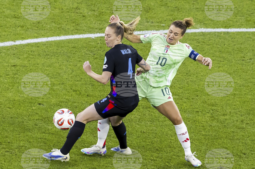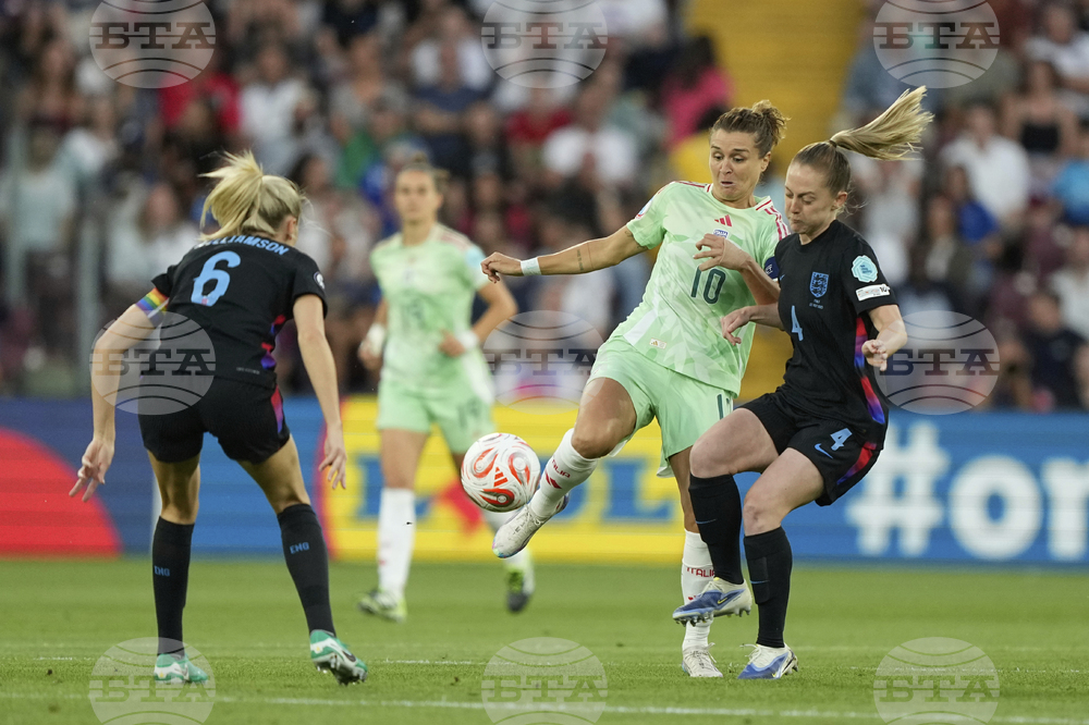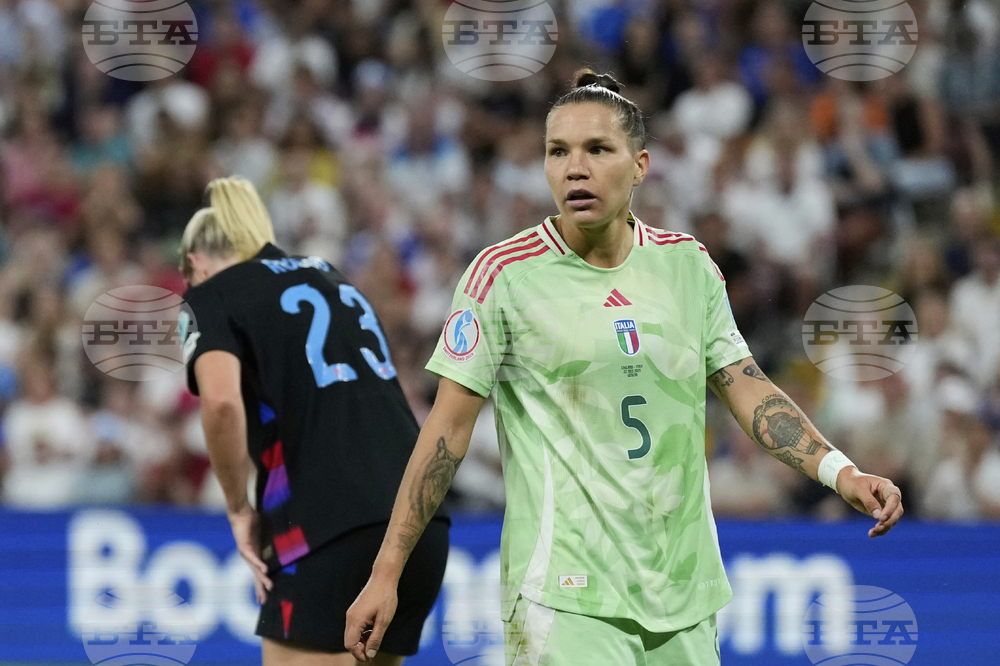 Italy's Barbara Bonansea, right, vies for the ball with England's Lucy Bronze during the Women's Euro 2025 semifinals soccer match between England and Italy at Stade de Geneve in Geneva, Switzerland, Tuesday, July 22, 2025. (AP Photo/Alessandra Tarantino)