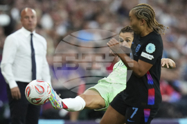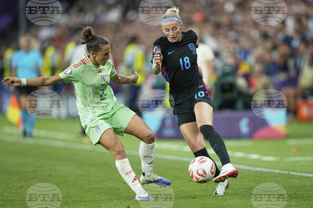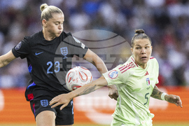 England's Lauren Hemp, left, challenges for the ball with Italy's Martina Lenzini during the Women's Euro 2025 semifinals soccer match between England and Italy at Stade de Geneve in Geneva, Switzerland, Tuesday, July 22, 2025. (AP Photo/Martin Meissner)